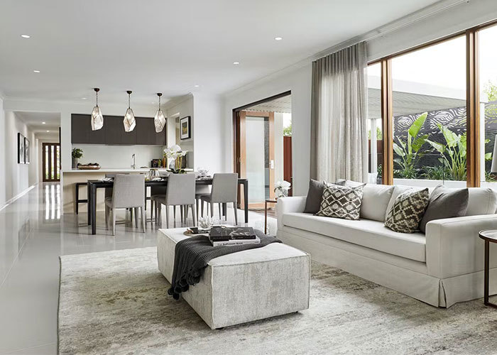 घर के पीछे की ओर एक आरामदायक लिविंग रूम है, जो भोजन और रसोई क्षेत्र से थोड़ा अलग है। यह दिन के अंत में विश्राम, बातचीत या पारिवारिक समय के लिए एक शांत स्थान बनाता है।
