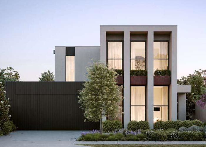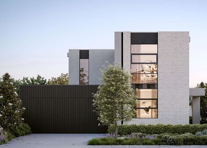 To the left, a spacious two-car garage provides secure parking and additional storage capacity, seamlessly integrated into the overall architectural composition without dominating the streetscape.